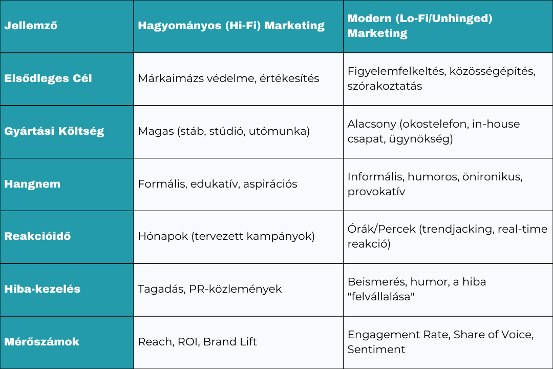 A 2020-as évek marketingjének egyik legmeghatározóbb jelensége a "Lo-Fi" (Low Fidelity - alacsony minőségű/természetes) tartalmak térnyerése a "Hi-Fi" (High Fidelity - stúdióminőségű) anyagokkal szemben.